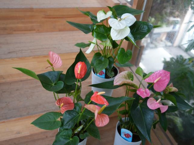 ハート型の鮮やかな花と光沢のある葉が魅力の アンスリウム(*^o^*)