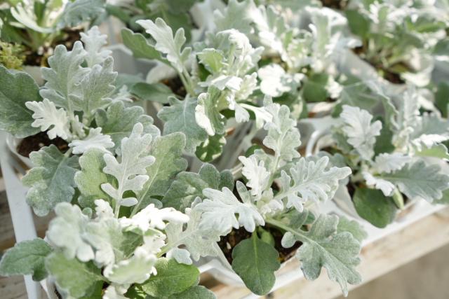 シロタエギクはキク科の耐寒性多年草で、白い産毛が生えた銀白色の葉をもつシルバーリーフです。