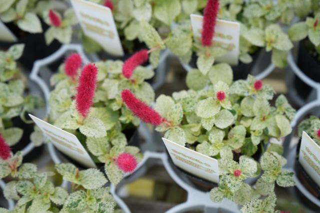 ネコジャラシのようにふさふさとした真っ赤な花穂を多数つける、愛嬌のある花キャットテールの斑入り葉品種。