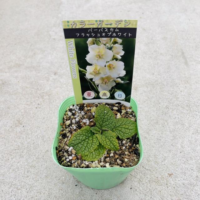 ゴマノハグサ科の宿根草(または二年草)で、真っ白な花を垂直に立ち上がる花穂に咲かせる清楚な品種です。地面にロゼット状(バラの花のよう)に葉を広げ、中央からまっすぐ花茎を伸ばします。花は純白色で、中心部の雄しべには紫色の毛があり、コントラストが美しいです。約60〜90cm程度まで成長し、花壇の中段から後方に植えると見栄えがします。4月〜7月頃。花後に茎を切り戻すと、返り咲きすることもあります。