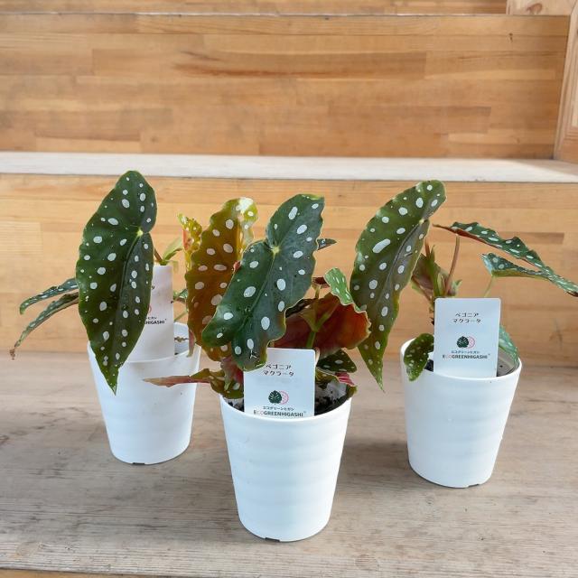 こちらも非常に人気のあるシュラブ(木立ち)性ベゴニアです。「ホワイトアイス」と同じく、美しい斑点模様の葉と、優雅に垂れ下がる花が特徴です。「ホワイトアイス」と同様に、細長い葉にはっきりとした白い水玉模様(ポルカドット)が入ります。大きな違いは、葉の裏側が鮮やかな赤紫色である点です。「ホワイトアイス」よりもドットが大きく、コントラストが強い傾向があります。