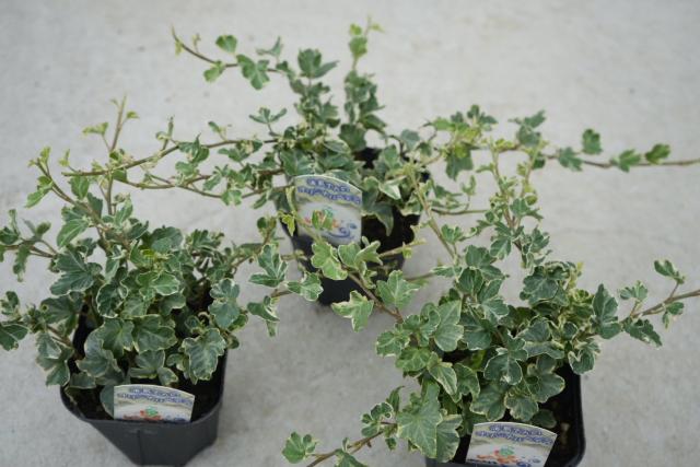 白の斑が入った小ぶりの葉が特徴で、丸みを帯びた切れ込みがエレガントな雰囲気を持つアイビー(西洋キヅタ)の品種です。