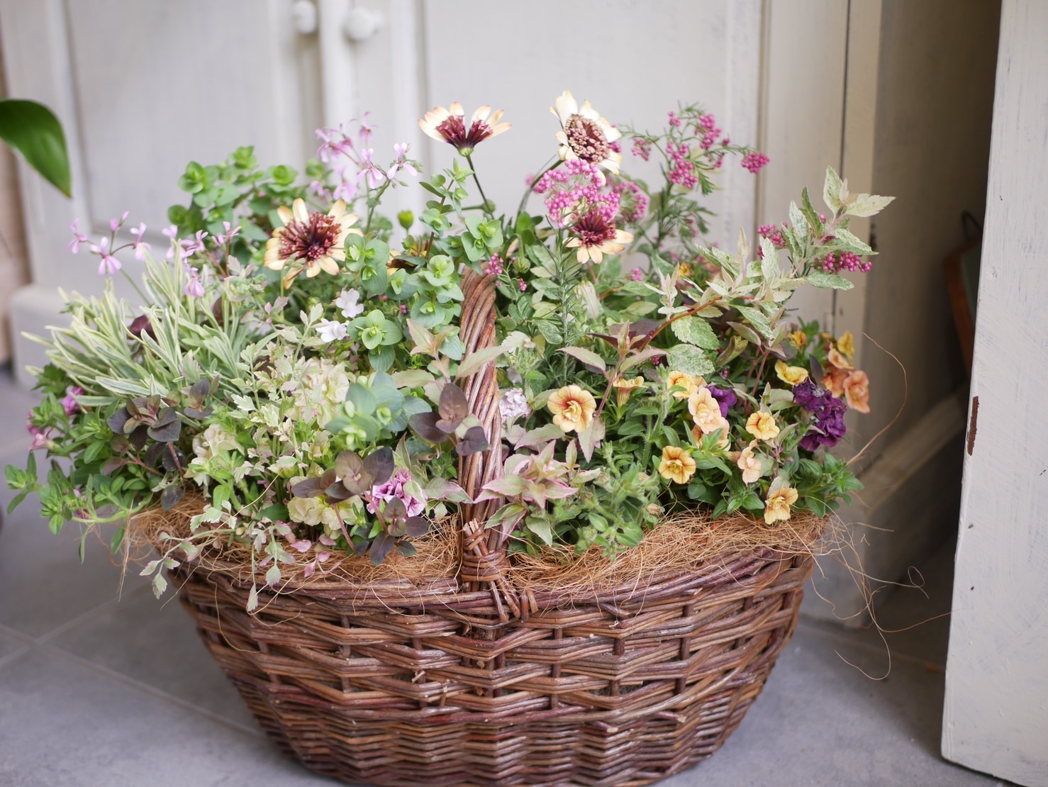 雰囲気に合う鉢と色華やかな花苗を植え込むことで長く楽しめます。